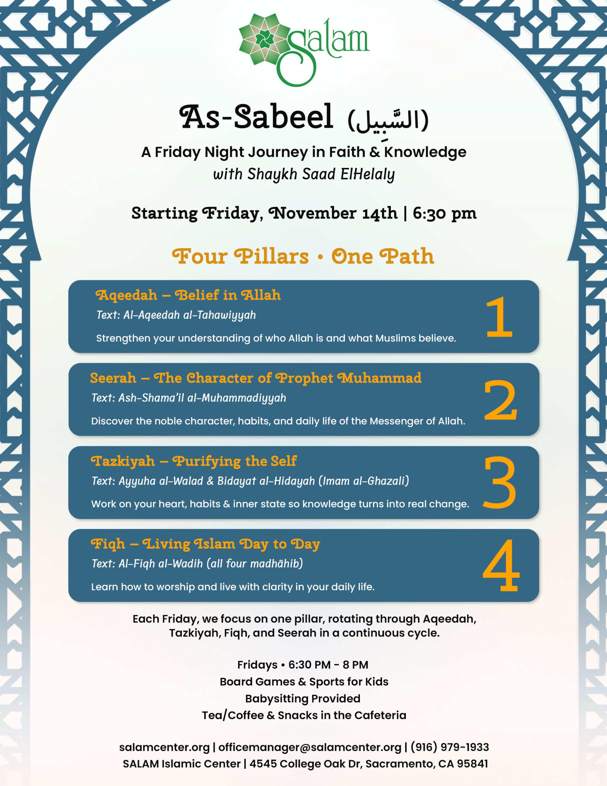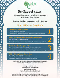 Each Friday, we focus on one pillar, rotating through Aqeedah, Tazkiyah, Fiqh, and Seerah in a continuous cycle.