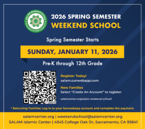 Weekend School – Spring ’26 2026 Spring Semester Pre-K thru 12th Grade Semester Starts | January 11, 2026 Semester Ends | May 17, 2026 School Hours Sundays Core | 10:00 AM – 2:00 PM SALAM Islamic Center 4541 College Dr. Sacramento, CA 95841 Learn more and Register + Add to Google Calendar + iCal / Outlook export Date Jan 25 2026 Time 10:00 am - 2:00 pm Location SALAM Community Center 4541 College Oak Dr., Sacramento, CA 95841 Category Weekend School Next Occurrence Go to occurrence page Date Feb 01 2026 Time 10:00 am - 2:00 pm Share this event