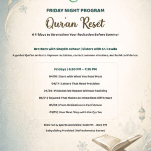 Friday Night Program Starting Friday, April 10 Starting April 10, join us for Qur’an Reset — a 6-week guided Friday night series designed to help strengthen your recitation before summer....